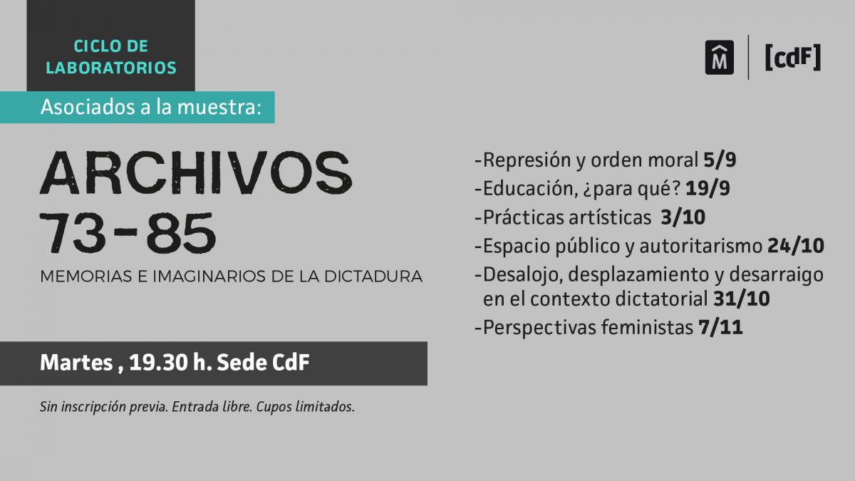 Este ciclo de seis laboratorios busca ser un espacio de intercambio y discusión sobre temas que pueden ser activados por la exposición Archivos 73-85. Memorias e imaginarios de la dictadura, en la Sede CdF. Cada laboratorio propone una perspectiva posible para observar la exposición e invitaremos a tres personas vinculadas a la temática a compartir reflexiones, abrir preguntas y sumar sentidos a la propuesta de la muestra.