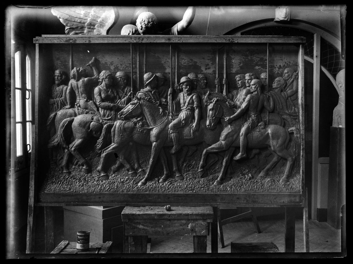 | Asunto o título atribuido(+) | Proceso de trabajo de un relieve del monumento a Leonardo Olivera. Taller de José Belloni. |