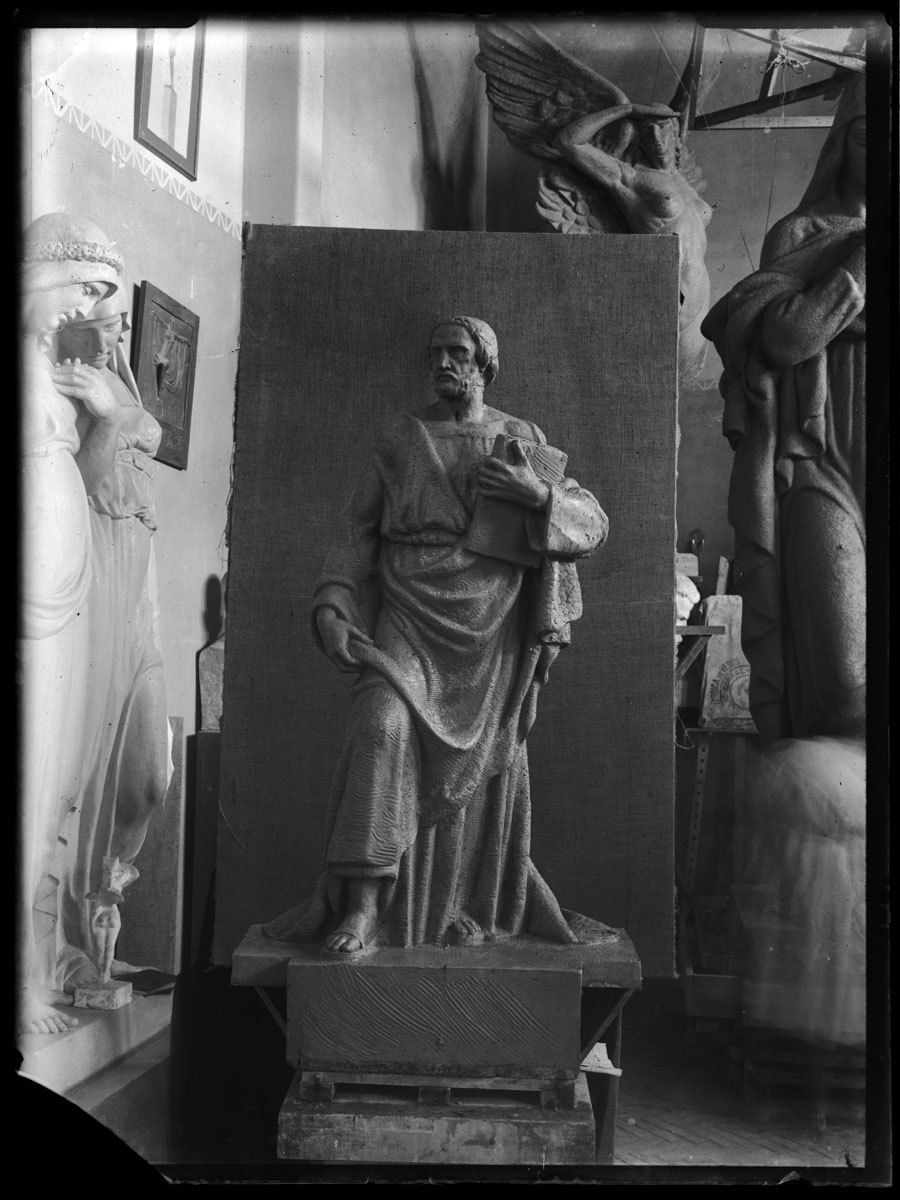 | Asunto o título atribuido(+) | Proceso de trabajo de la estatua de Santiago Apóstol para la Basílica Catedral de Montevideo. Taller de José Belloni. |