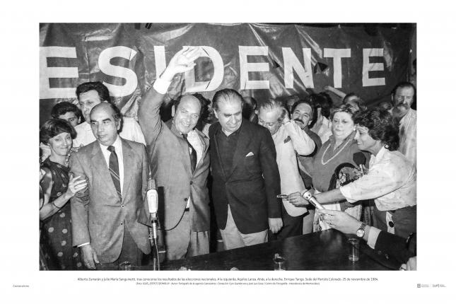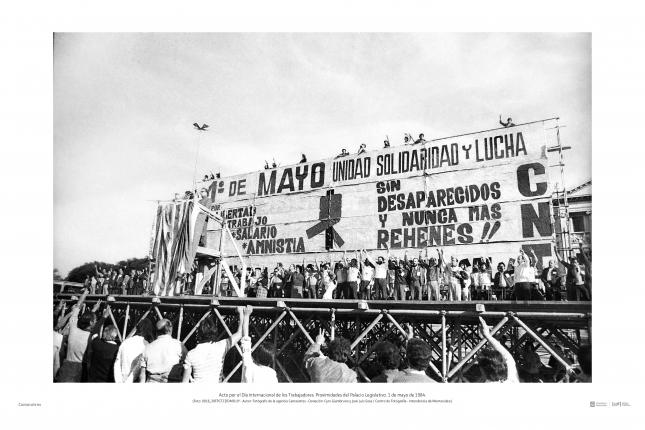 Esta muestra está compuesta por fotografías tomadas en ese contexto por la agencia Camaratres, un colectivo integrado por Cyro Giambruno y José Luis Sosa que actuó entre los últimos días de 1983 y los primeros de 1985, en simultáneo con el renacimiento de la prensa de oposición.