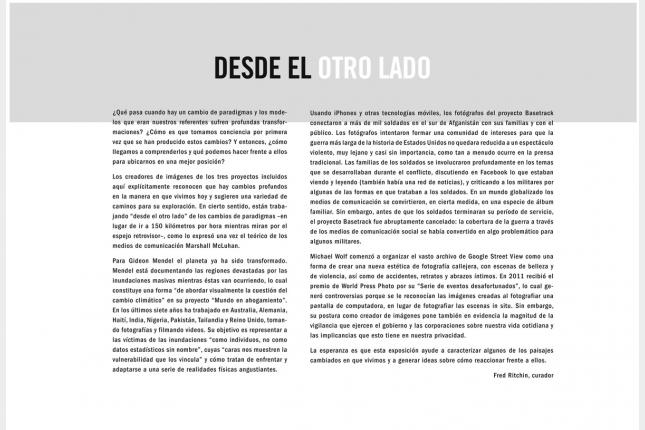 Los creadores de imágenes de los tres proyectos incluidos aquí explícitamente reconocen que hay cambios profundos en la manera en que vivimos hoy y sugieren una variedad de caminos para su exploración. En cierto sentido, están trabajando “desde el otro lado” de los cambios de paradigmas –en lugar de ir a 150 kilómetros por hora mientras miran por el espejo retrovisor–, como lo expresó una vez el teórico de los medios de comunicación Marshall McLuhan.