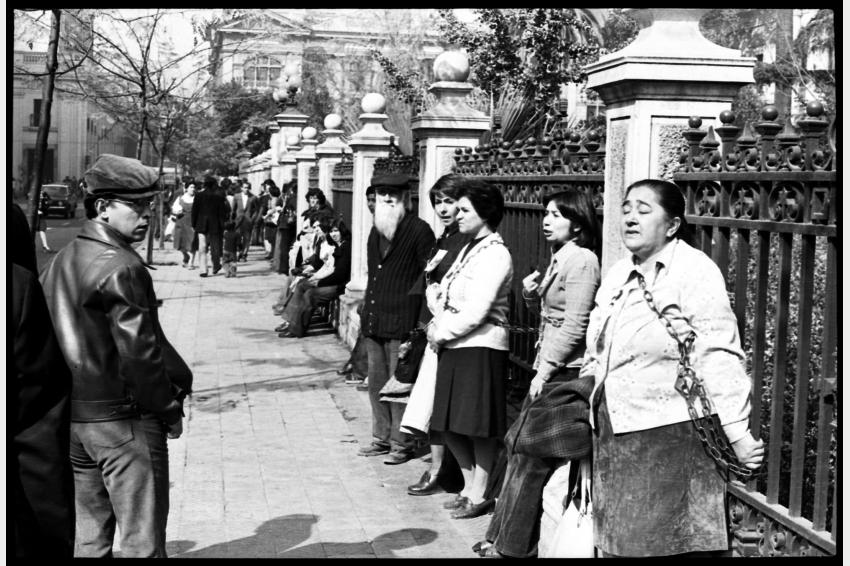 Encadenamiento en el Congreso, 1978. Copia digital desde negativo análogo 35mm. Fondo Navarro. Biblioteca Nacional de Chile.