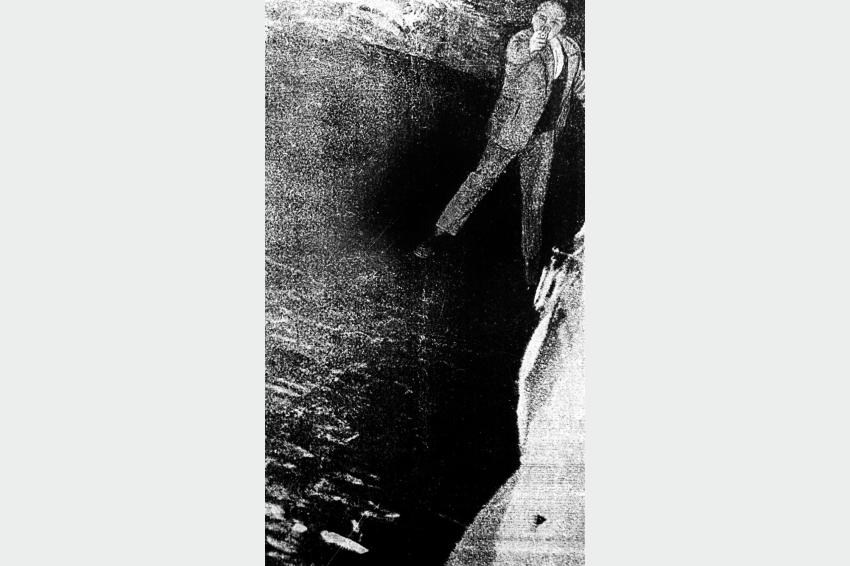 El agente de Inteligencia y Enlace Tellechea, apuntando a Aurelio González durante las manifestaciones en repudio a la invasión estadounidense a Santo Domingo. Mayo de 1965. Fotografía digitalizada a partir de reproducción en papel. (Foto: 252AGon)