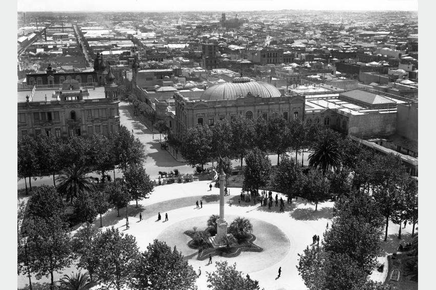 Vista aérea de la Plaza Cagancha. Al centro, adelante: Columna de la Paz. Al centro, al fondo: Ateneo de Montevideo. Año 1916. (Foto: 1168FMHB.CDF.IMO.UY - Autoría: Fotógrafos municipales / Centro de Fotografía – Intendencia de Montevideo).