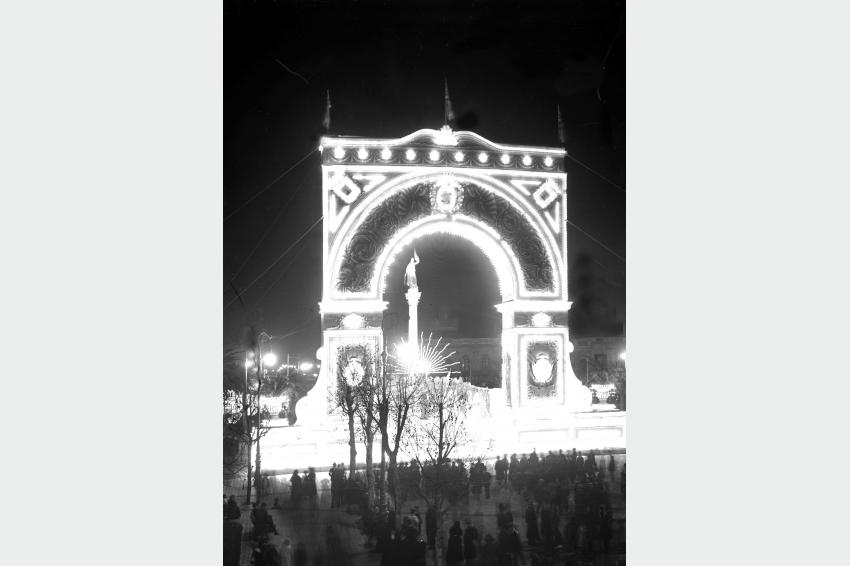 Arco decorativo para la conmemoración de la Declaratoria de la Independencia. Al fondo: Columna de la Paz. Plaza Cagancha. 24-25 de agosto de 1911. (Foto: 1542FMHB.CDF.IMO.UY - Autoría: Fotógrafos municipales / Centro de Fotografía – Intendencia de Montevideo).