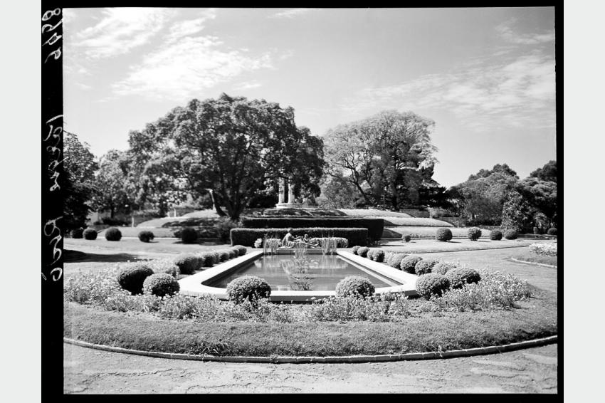 Fuente coronada con un templete de planta circular en el Parque Rodó. Vista desde la avenida Gonzalo Ramírez. Año 1942. S.d.a./IMM. Foto 8946FMH.CMDF.IMM.UY