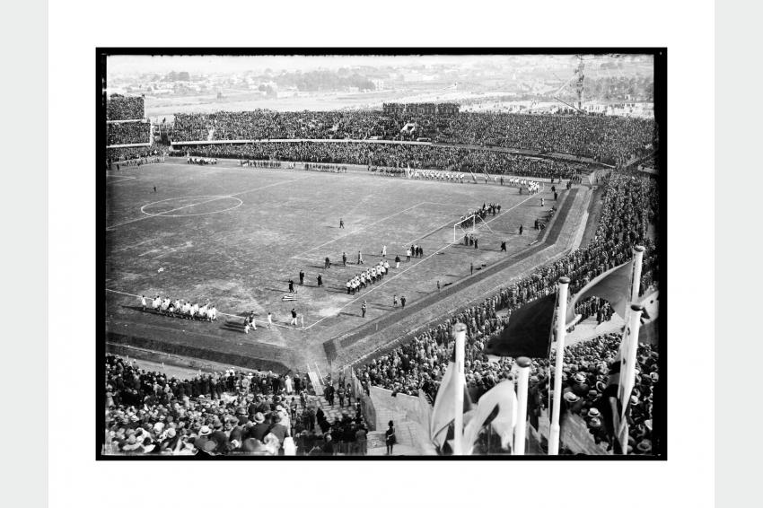 Ceremonia inaugural del Estadio Centenario. Desfile de delegaciones participantes de la Copa Mundial de Fútbol. Al fondo: tribuna América. 18 de julio de 1930. (Foto: 0078FMHD.CDF.IMO.UY - Autor: S.d./IMO).