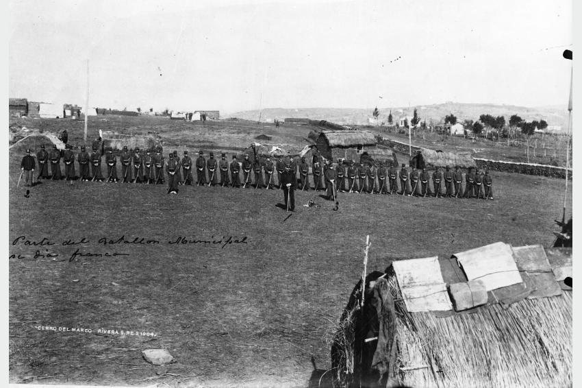 Tropas del ejército gubernista pertenecientes al Regimiento N° 2 durante la guerra civil de 1904. Cerro del Marco. Departamento de Rivera. Reproducción de copia fotográfica. Año 1904. (Foto: 0118FMHG.CDF.IMO.UY - Autoría: Fotógrafos municipales / Centro de Fotografía – Intendencia de Montevideo).