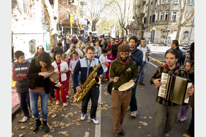 Adelante: Andrés Rubinstein, Matías Rodriguez, Fernando Nathan, Violin Betina Chavez y Pablo Guillama integrantes de la Klezmeron Orkestra. Jornada Pintando Veredas. Calles Soriano esquina Salto. Barrio Cordón. 05 de mayo de 2014. (Foto: 46004FMCMA.CDF.IMO.UY - Autor: Carlos Contrera/CdF).