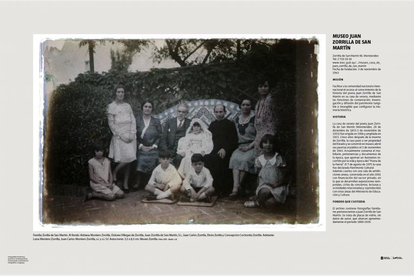 Familia Zorilla de San Martín. Al fondo: Adriana Montero Zorrilla, Dolores Villegas de Zorrilla, Juan Zorrilla de San Martín, S.i., Juan Carlos Zorrilla, Elvira Zorilla y Concepción Cochonita Zorrilla. Adelante:Luisa Montero Zorrilla, Juan Carlos Montero Zorrilla, s.i. y s.i. S.f. Autocromo. 5,5 x 8,5 cm. Museo Zorrilla. Foto: 020 - Autor: s.d.