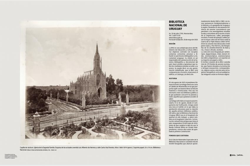 Capilla de Jackson. Iglesia de la Sagrada Familia. Esquina de las actuales avenida Luis Alberto de Herrera y calle Carlos Vaz Ferreira. Años 1860-1874 (aprox.). Soporte papel. 23 x 19 cm. Biblioteca Nacional. Álbum: Vistas de Montevideo de Bate y Cía. - Autor: s.d.