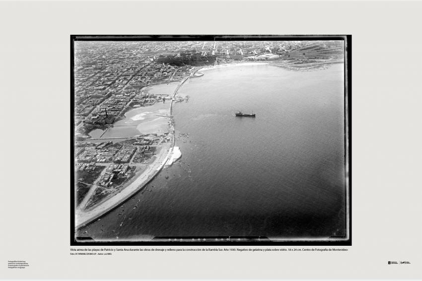 Vista aérea de las playas de Patricio y Santa Ana durante las obras de drenaje y relleno para la construcción de la Rambla Sur. Año 1930. Negativo de gelatina y plata sobre vidrio. 18 x 24 cm. Centro de Fotografía de Montevideo:Foto: 0174FMHB.CDF.IMO.UY - Autor: s.d./IMO.