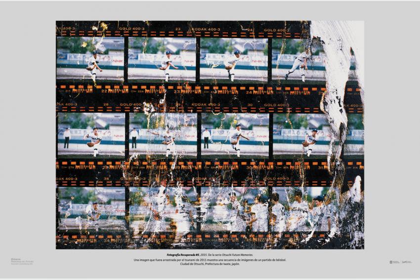 Fotografía Recuperada #5, 2015. De la serie Otsuchi Future Memories. Una imagen que fuera arrastrada por el tsunami de 2011 muestra una secuencia de imágenes de un partido de béisbol. Ciudad de Otsuchi, Prefectura de Iwate, Japón.