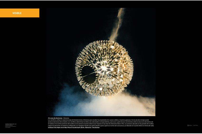 Los científicos utilizan la espectroscopia de fotoelectrones y fotoiones para estudiar las propiedades de cuerpos sólidos y muestras gaseosas. Una luz de alta energía puede arrancar electrones de la materia. Los científicos determinan la órbita y las velocidades correspondientes, para sacar a partir de eso conclusiones sobre la estructura electrónica de la materia. En el centro luminoso de la esfera se encuentra la muestra sobre la que impacta el rayo láser de electrones libres o FEL. Los sensores ubicados en las paredes de la esfera captan los electrones. El sistema es refrigerado con nitrógeno líquido que gotea desde la parte superior al centro de la secuencia y es liberado en la parte inferior en forma de nube.
