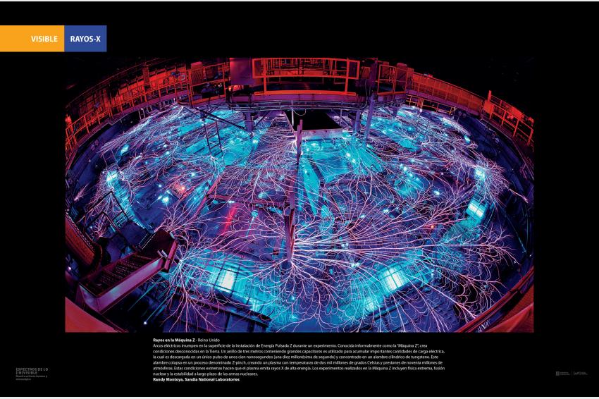 Arcos eléctricos irrumpen en la superficie de la Instalación de Energía Pulsada Z durante un experimento. Conocida informalmente como la “Máquina Z”, crea condiciones desconocidas en la Tierra. Un anillo de tres metros conteniendo grandes capacitores es utilizado para acumular importantes cantidades de carga eléctrica, la cual es descargada en un único pulso de unos cien nanosegundos (una diez millonésima de segundo) y concentrado en un alambre cilíndrico de tungsteno. Este alambre colapsa en un proceso denominado Z-pinch, creando un plasma con temperaturas de dos mil millones de grados Celsius y presiones de noventa millones de atmósferas. Estas condiciones extremas hacen que el plasma emita rayos X de alta energía. Los experimentos realizados en la Máquina Z incluyen física extrema, fusión nuclear y la estabilidad a largo plazo de las armas nucleares.