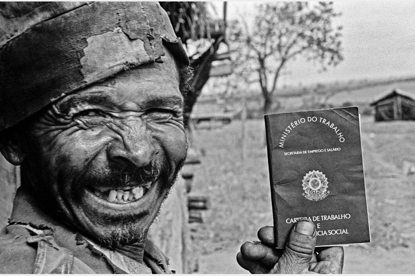Sr. Ataliba dos Santos, carbonero, víctima de trabajo esclavo, con su primer carné de trabajo, Ribas do Rio Pardo, Mato Grosso do Sul, Brasil. Año 1988. Negativo 35 mm.