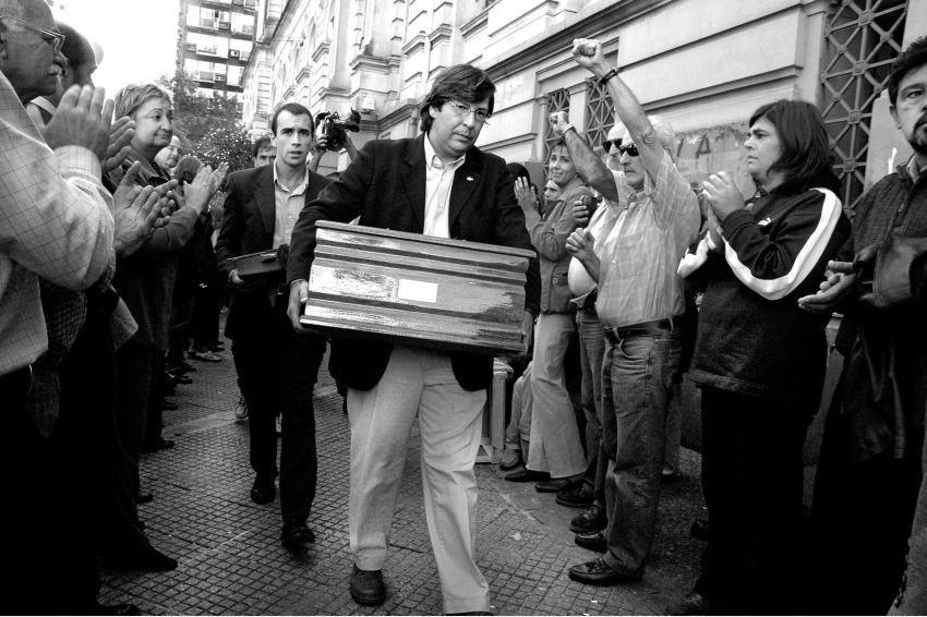 Javier Miranda carga la urna con los restos de su padre, el escribano Fernando Miranda, tras un homenaje en la Facultad de Derecho. Fernando Miranda fue un militante comunista desaparecido en la pasada dictadura militar. Sus restos se encontraron en el Batallón Nº13. Centro de Montevideo, 30 de marzo de 2006. Foto: Sandro Pereyra.