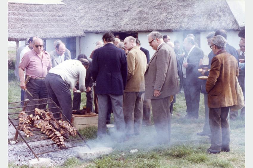 Integrantes del Partido Nacional reunidos en lo previo al plebiscito por el proyecto de reforma constitucional del año 1980. De izquierda a derecha el tercero es Ulises Pivel Devoto, el quinto es Yamandú Tourné y el sexto es Fernando Oliú. Quinta de Alberto Zumarán. Foto 0323FPMC.CMDF.IMM.UY. Donación Alberto Zumarán.