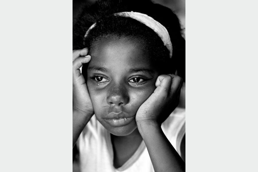 Hija de trabajadora muerta en explosión de fábrica clandestina de fuegos artificiales en Santo Antonio de Jesus. En este episodio murieron 64 mujeres. Las fábricas clandestinas siguen funcionando en la ciudad, ya que no se le ha ofrecido opciones alternativas de trabajo a los habitantes de las favelas locales, quienes siguen siendo mano de obra en situación análoga a la de los esclavos, para esos comerciantes que hasta el día de hoy no han sido condenados ni detenidos. Bahía, Brasil. Año 2002. Fotografía digital.