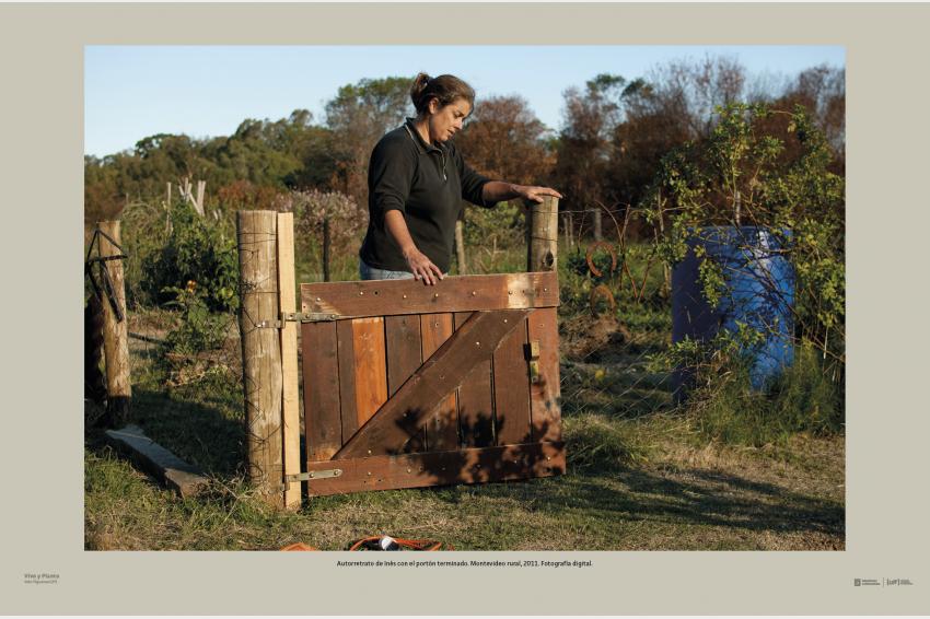 Autorretrato de Inés con el portón terminado. Montevideo rural, 2011. Fotografía digital.