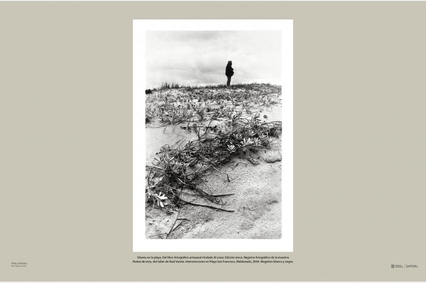 Silueta en la playa. Del libro fotográfico artesanal titulado Al cruce. Edición única. Registro fotográfico de la muestra Puntos de vista, del taller de Raúl Varela. Intervenciones en Playa San Francisco, Maldonado, 2004. Negativo blanco y negro.