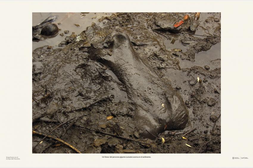 Un fémur del perezoso gigante Lestodon asoma en el sedimento.