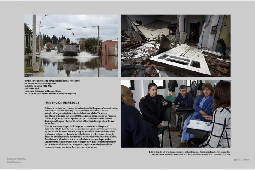 PREVENCIÓN DE RIESGOS. El Sinae ha contado con el apoyo de las Naciones Unidas para su fortalecimiento institucional en diferentes etapas y con distintos proyectos. A modo de ejemplo, el programa Fortalecimiento de las Capacidades Técnicas y Operativas, financiado con casi 300.000 dólares por el Sistema de las Naciones Unidas, apoyó los procesos de producción de conocimiento sobre factores de riesgo en Uruguay y fortaleció en todo el territorio la respuesta ante una emergencia. También se destaca el apoyo del Programa de Naciones Unidas para el Desarrollo (PNUD) durante el proceso de discusión participativa del proyecto de ley de creación del Sinae. Además, Uruguay recibió dos misiones de Naciones Unidas para elaborar un diagnóstico del estado de la reducción del riesgo de desastres a nivel nacional y para formular recomendaciones de política pública. Paralelamente, a través del proyecto de Fortalecimiento de Capacidades Departamentales para la Gestión de Riesgos en Uruguay, se institucionalizaron los Centros Coordinadores de Emergencias Departamentales (Cecoed) que funcionan en cada uno de los diecinueve departamentos. / Arriba: Nombre: Fortalecimiento de las Capacidades Técnicas y Operativas del Sistema Nacional de Emergencias. Período de ejecución: 2013-2015. Ámbito: Nacional. Cooperante: Sistema de las Naciones Unidas. nstitución nacional: Sistema Nacional de Emergencias (Sinae). / Dolores después del tornado, trabajos de Centro Coordinador de Emergencias Departamentales del Área Metropolitana e inundación en el litoral. 2016. Fotos: archivo del Sinae, Nicolás Celaya y Pablo La Rosa, de izq. a der.