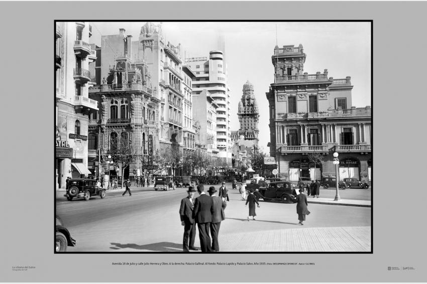 Avenida 18 de Julio y calle Julio Herrera y Obes. A la derecha: Palacio Gallinal. Al fondo: Palacio Lapido y Palacio Salvo. Año 1935. (Foto: 06510FMHGE.CDF.IMO.UY - Autor: S.d./IMO).