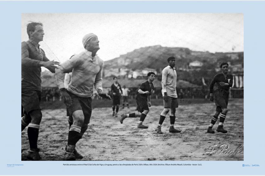 Partido amistoso entre las selecciones de España y Uruguay, previo a las olimpíadas de París 1924. Bilbao. Año 1924 (Archivo: Álbum Andrés Mazali, Colombia - Autor: S.d.).