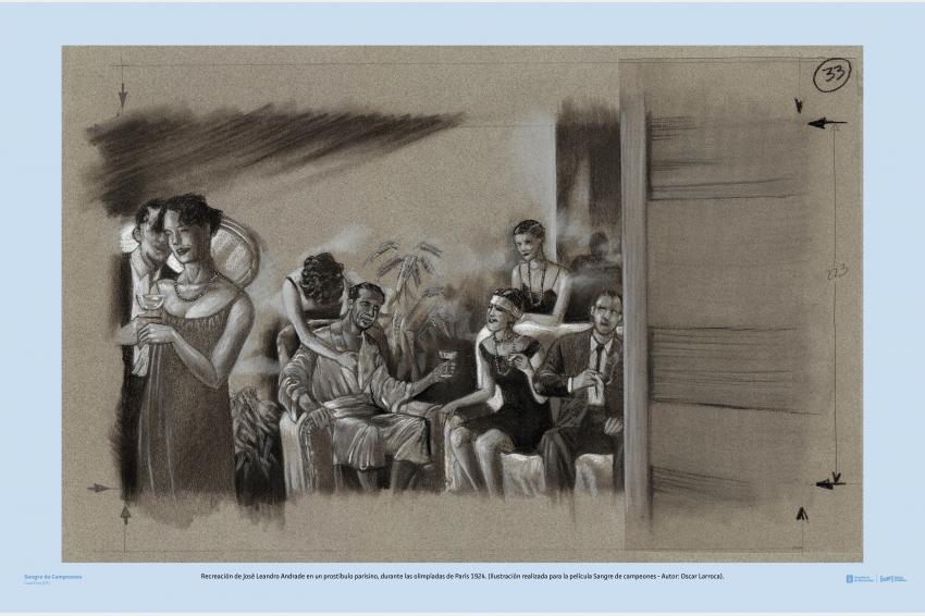Recreación de José Leandro Andrade en un prostíbulo parisino, durante las olimpíadas de París 1924. (Ilustración realizada para la película Sangre de campeones - Autor: Oscar Larroca).