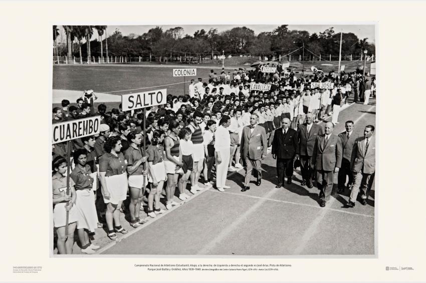Campeonato Nacional de Atletismo Estudiantil. Abajo, a la derecha: de izquierda a derecha el segundo es José Arias. Pista de Atletismo. Parque José Batlle y Ordóñez. Años 1939-1940. (Archivo fotográfico del Centro Cultural Pedro Figari, CETP-UTU - Autor: S.d./CETP-UTU).