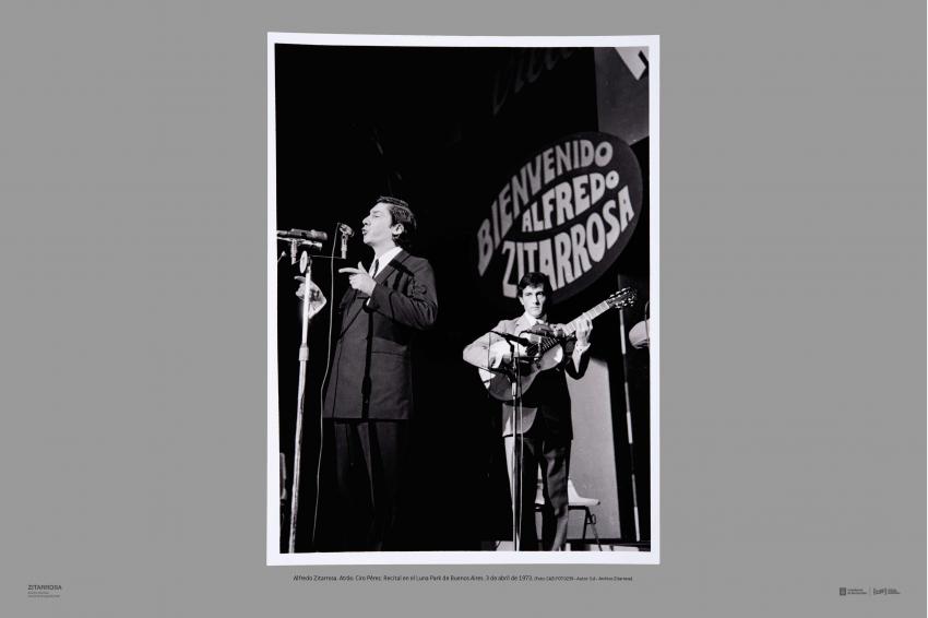 Alfredo Zitarrosa. Atrás: Ciro Pérez. Recital en el Luna Park de Buenos Aires. 3 de abril de 1973. (Foto: CAZI.FOT.0239 - Autor: S.d - Archivo Zitarrosa).