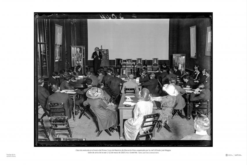 Clase de anatomía en el marco del Primer Curso de Maestros de Educación Física organizado por la cnef. Al fondo: José Alaggia. Salón de actos de la cnef. 2-12 de marzo de 1920. (Foto: 01486FSND - Autor: José Tato Lorenzo/cnef).