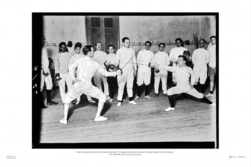 Asalto de esgrima. Pabellón de la Plaza de Deportes n.º 1. Aguada, Montevideo. Al centro: Fernando Vázquez. Año 1927 (aprox.). (Foto: 03883FSND - Autor: José Tato Lorenzo/cnef).