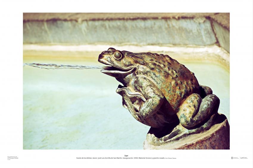 Sapo. Fuente de los Atletas. Autor: José Luis Zorrilla de San Martín. Inauguración: 1930. Material: bronce y granito rosado.