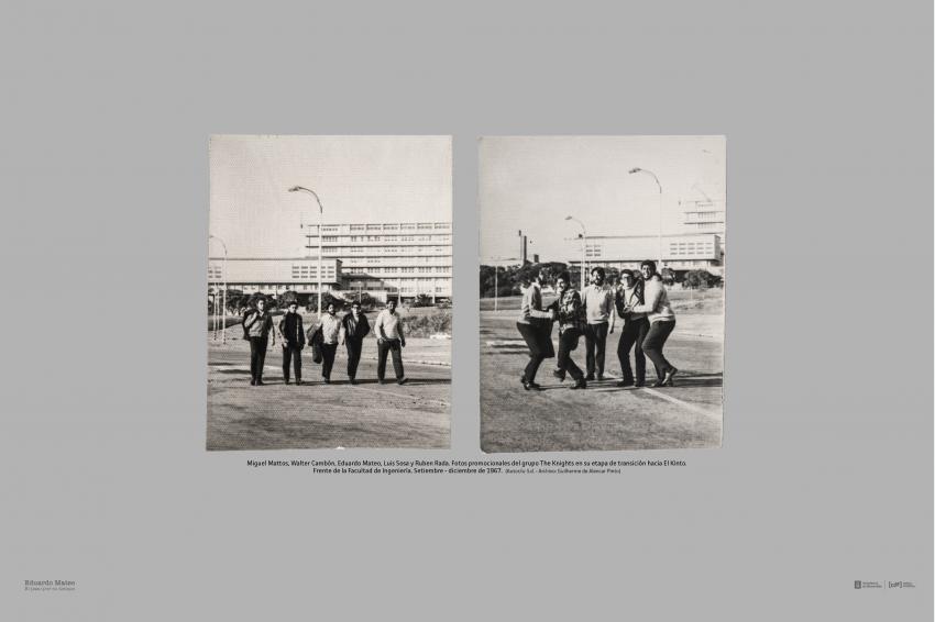 Miguel Mattos, Walter Cambón, Eduardo Mateo, Luis Sosa y Ruben Rada. Fotos promocionales del grupo The Knights en su etapa de transición hacia El Kinto. Frente de la Facultad de Ingeniería. Setiembre - diciembre de 1967. (Autor/a: S.d. - Archivo: Guilherme de Alencar Pinto)