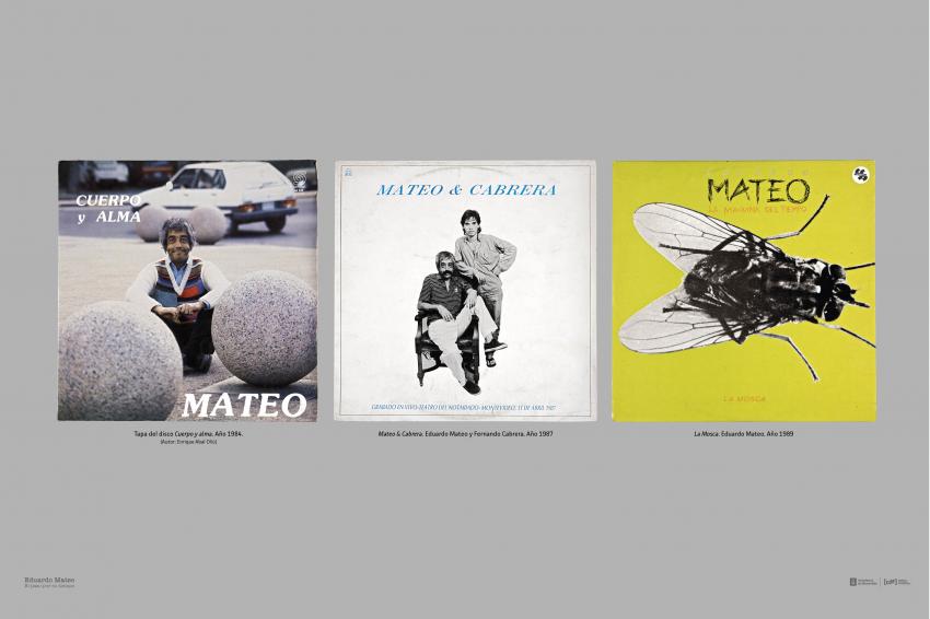Izquierda: Tapa del disco Cuerpo y alma. Año 1984. Centro: Mateo & Cabrera. Eduardo Mateo y Fernando Cabrera. Año 1987. Derecha: La Mosca. Eduardo Mateo. Año 1989 (Autor: Enrique Abal Oliú)