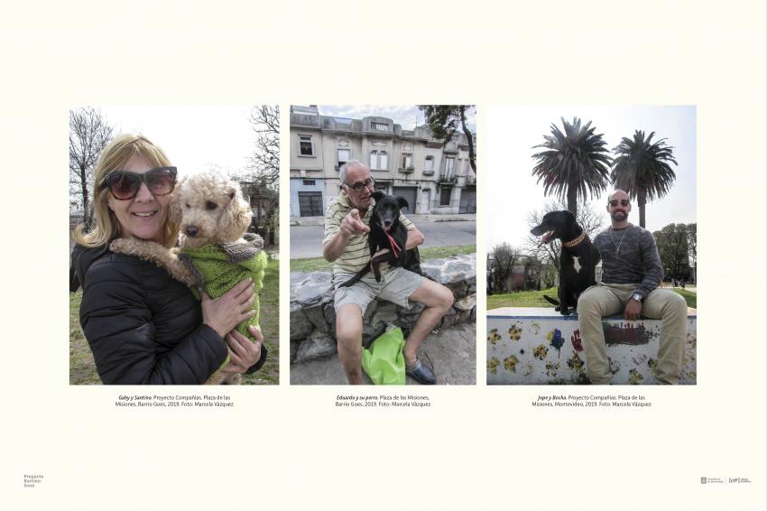 Izquierda: Gaby y Santino. Proyecto Compañías. Plaza de las Misiones, Barrio Goes, 2019. Foto: Marcela Vázquez. Centro: Eduardo y su perro. Plaza de las Misiones, Barrio Goes, 2019. Foto: Marcela Vázquez. Derecha: Jope y Bocha. Proyecto Compañías. Plaza de las Misiones, Montevideo, 2019. Foto: Marcela Vázquez.