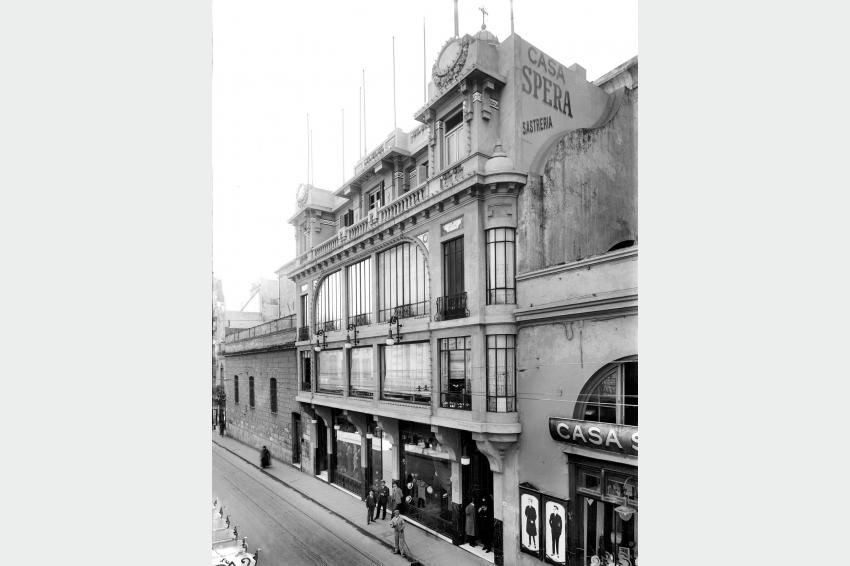 Antigua Sastrería Spera, calle Sarandí. Construida entre los contrafuertes de la Catedral y demolida hacia 1970. Año 1919. (Foto: 27FMHA.CMDF.IMM.UY – Autor: S.d.)
