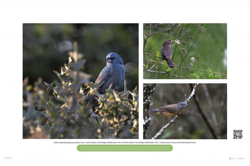 Azulito (Cyanoloxia glaucocaerulea). Foto a: macho adulto, Punta Negra, Maldonado. Foto b: hembra adulta, Punta Negra, Maldonado. Foto c: macho juvenil, Sierras de Rocha (Ambá), Rocha.