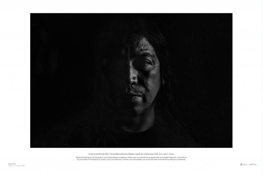 Machi Juan Queupumil, de Huichahue, zona militarizada por el gobierno chileno ante el avance de las recuperaciones territoriales mapuches. La función de las y los machis es interpretar los sueños, curar a los enfermos y orientar a las comunidades. Son un vínculo entre el mundo de los antiguos y el presente.