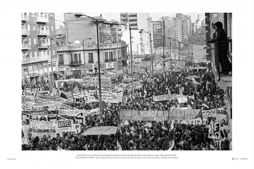 Acto del Pit Cnt en reclamo de amnistía para los presos políticos. Avenida Libertador y Avenida de las Leyes. 19 de agosto de 1984. (Foto: 0050_08aFPCT.CDF.IMO.UY - Autor: Fotógrafo de la agencia Camaratres - Donación: Cyro Giambruno y José Luis Sosa / Centro de Fotografía - Intendencia de Montevideo).