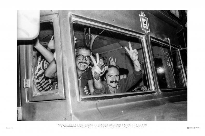 Muti y Figueroa. Liberación de los últimos presos políticos en las inmediaciones de la Jefatura de Policía de Montevideo. 10-14 de marzo de 1985. (Foto: 0086_56FPCT.CDF.IMO.UY - Autor: Fotógrafo de la agencia Camaratres - Donación: Cyro Giambruno y José Luis Sosa / Centro de Fotografía - Intendencia de Montevideo).