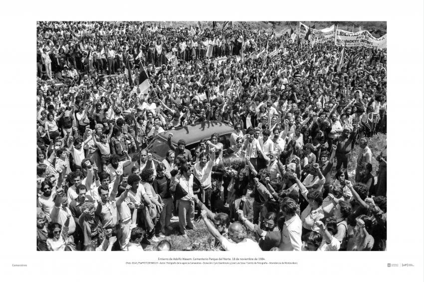 Entierro de Adolfo Wasem. Cementerio Parque del Norte. 18 de noviembre de 1984. (Foto: 0143_75aFPCT.CDF.IMO.UY - Autor: Fotógrafo de la agencia Camaratres - Donación: Cyro Giambruno y José Luis Sosa / Centro de Fotografía - Intendencia de Montevideo).