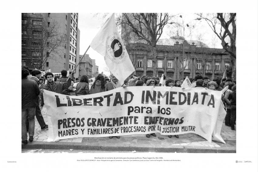 Movilización en reclamo de amnistía para los presos políticos. Plaza Cagancha. Año 1984. (Foto: 0129_41FPCT.CDF.IMO.UY - Autor: Fotógrafo de la agencia Camaratres - Donación: Cyro Giambruno y José Luis Sosa / Centro de Fotografía - Intendencia de Montevideo).