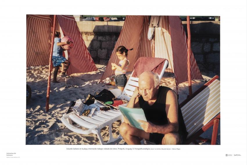 Eduardo Galeano en la playa, intentando trabajar, rodeado de nietos. Piriápolis, Uruguay. S.f. Fotografía analógica. Autor: S.d. Archivo: Eduardo Galeano – Helena Villagra