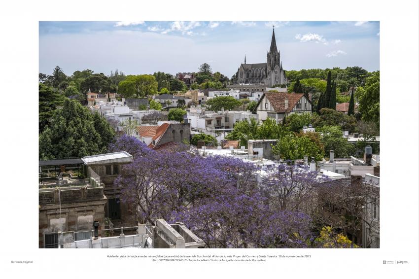 Adelante, vista de los Jacarandas mimosifolias (jacarandás) de la avenida Buschental. Al fondo, iglesia Virgen del Carmen y Santa Teresita. 18 de noviembre de 2023. (Foto: 98175FMCMA.CDF.IMO.UY – Autora: Lucía Martí / Centro de Fotografía – Intendencia de Montevideo).
