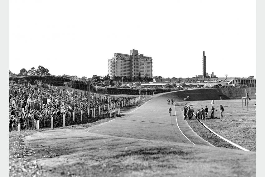 Competencia de ciclismo en pista. Velódromo Municipal “Atilio François”. Al fondo: Hospital “Dr. Manuel Quintela” y Estadio Centenario. Año 1948. (Foto: 08306FMHGE.CDF.IMO.UY - Autoría: Fotógrafos municipales / Centro de Fotografía – Intendencia de Montevideo).
