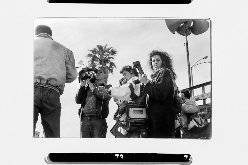Nancy Urrutia durante la cobertura de un acto sindical. Montevideo, 28 de agosto de 1990.