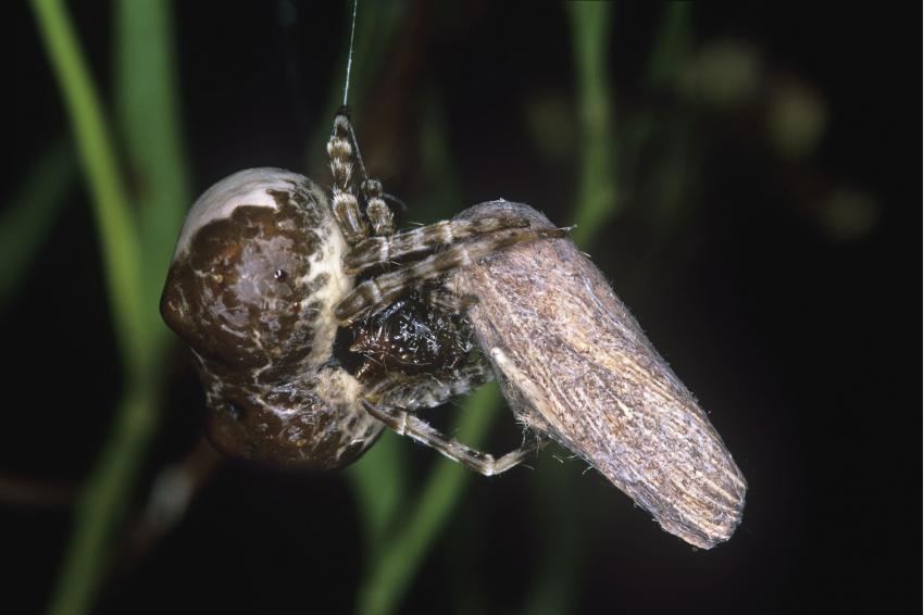 dorso, a modo de pezones de vaca. Constituye la excepción dentro de la familia ya que no construye telas típicas. Utiliza un hilo de seda pegajoso para la captura. La hembra emite sustancias similares a las feromonas femeninas de una polilla y los machos de polilla acuden engañados. En ese momento, la araña realiza movimientos pendulares